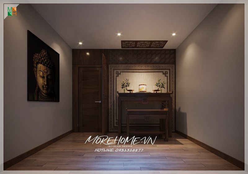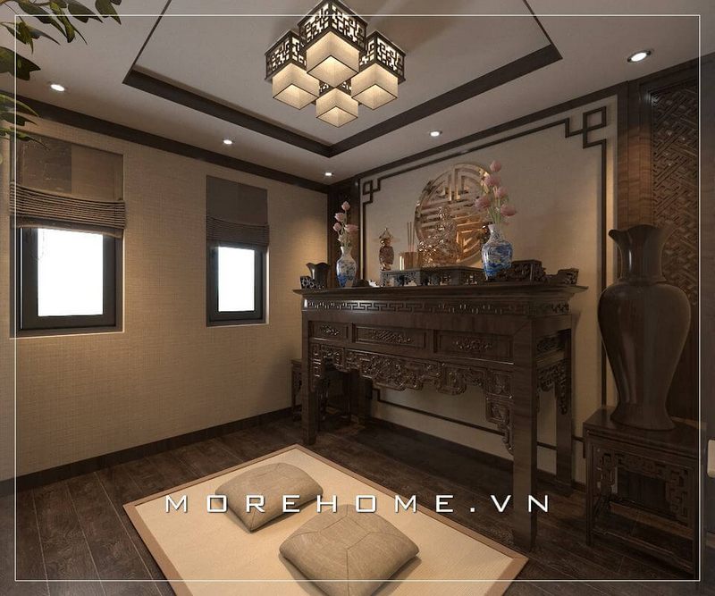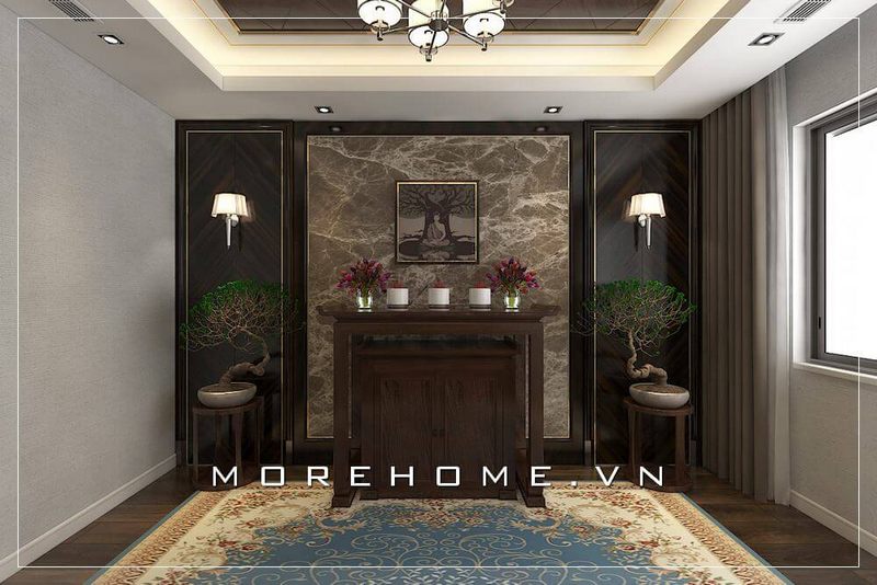 Bàn thờ với màu sắc trầm khu vực thể hiện sự tôn nghiêm âm cúng và yên tĩnh, sử dụng vật liệu bằng gỗ thể hiện sự uy nghiêm thờ cúng của dân việt.