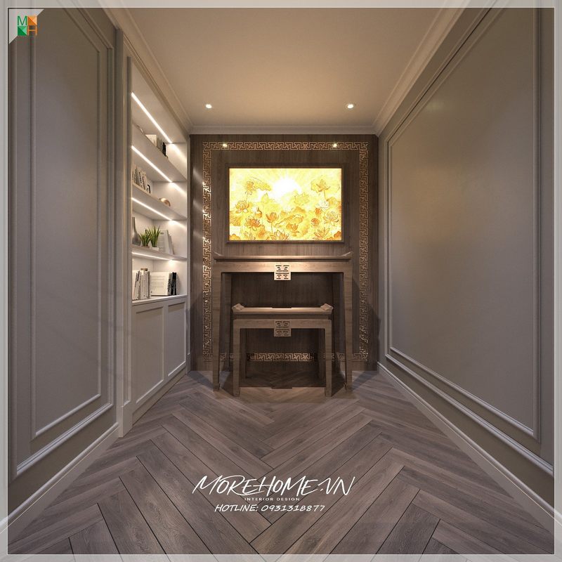 Ấn tượng với mẫu thiết kế phòng thờ là 2 bàn thờ gồm 1 bàn lớn lớn và 1 bàn nhỏ, khung kệ sau bàn thờ thiết kế với họa tiết rất công phu và điêu luyện. Tất cả nội thất đều sản xuất bằng gỗ tự nhiên, đặc biệt là loại gỗ óc chó cao cấp và sang trọng.