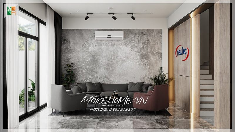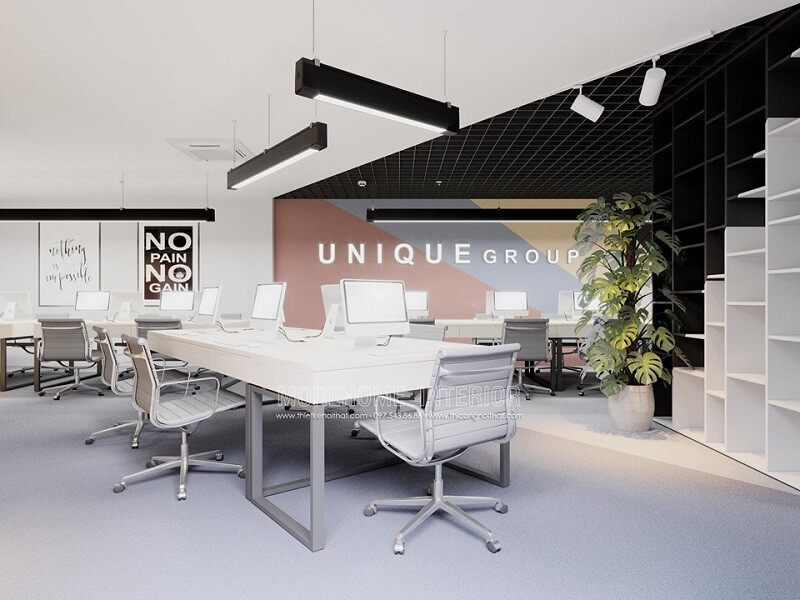 Thiết kế văn phòng công ty UNIQUE GRORP với không gian mở gồm quầy lễ tân phòng làm việc nhân viên, phòng họp, phòng giám đốc..