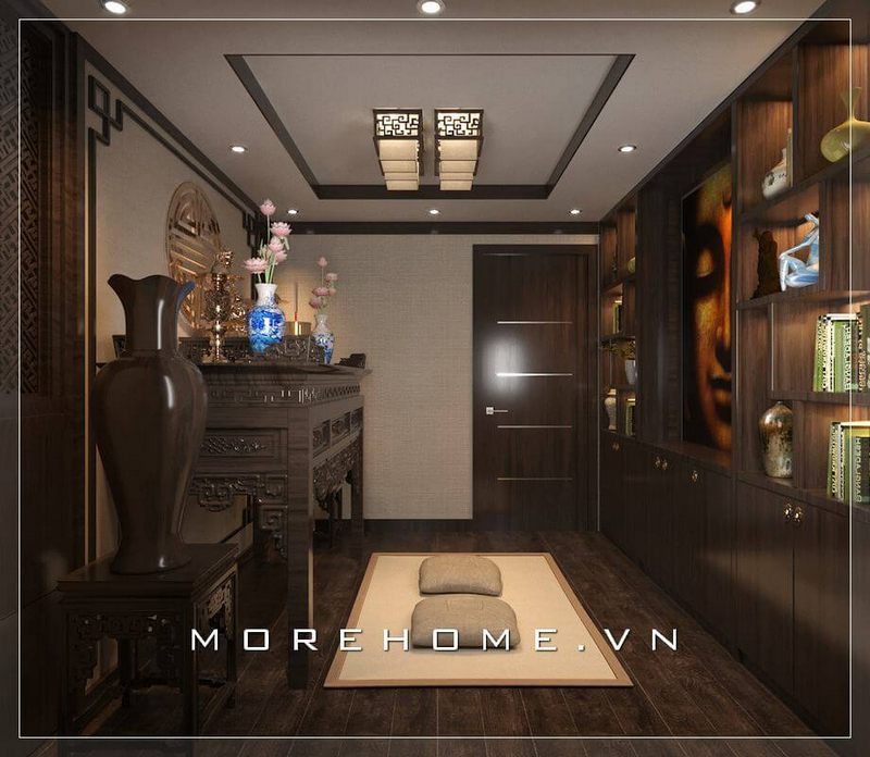 Gợi ý mẫu thiết kế phòng thờ cho chung cư, nhà phố tổng thể màu sắc nhã nhặn hài hòa không gian thiêng liêng nơi đây màu nâu trầm tạo nên sự ấm cúng ấm áp của căn phòng