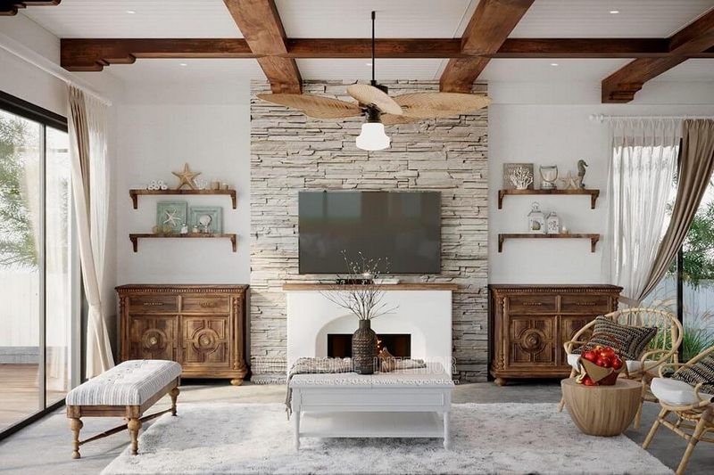 Trang trí phòng khách biệt thự với kệ trang trí gỗ tự nhiên