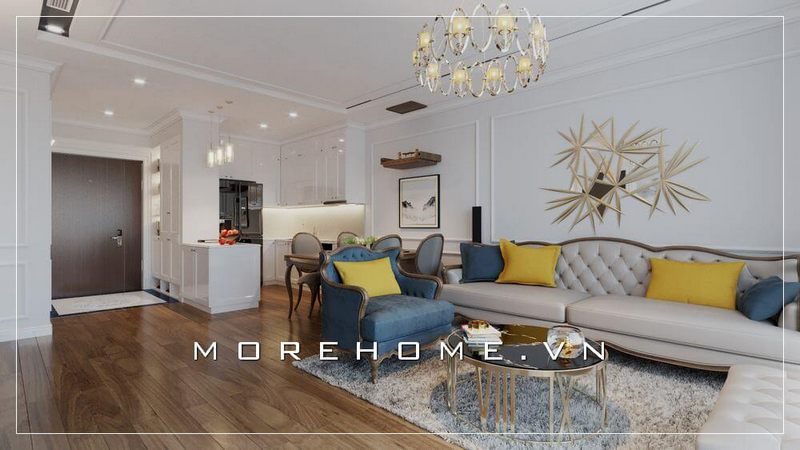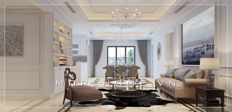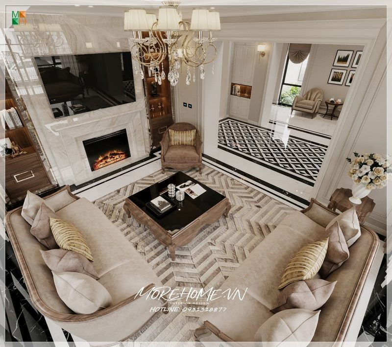 Thi công nội thất phòng khách ấn tượng với thiết kế tân cổ điển
