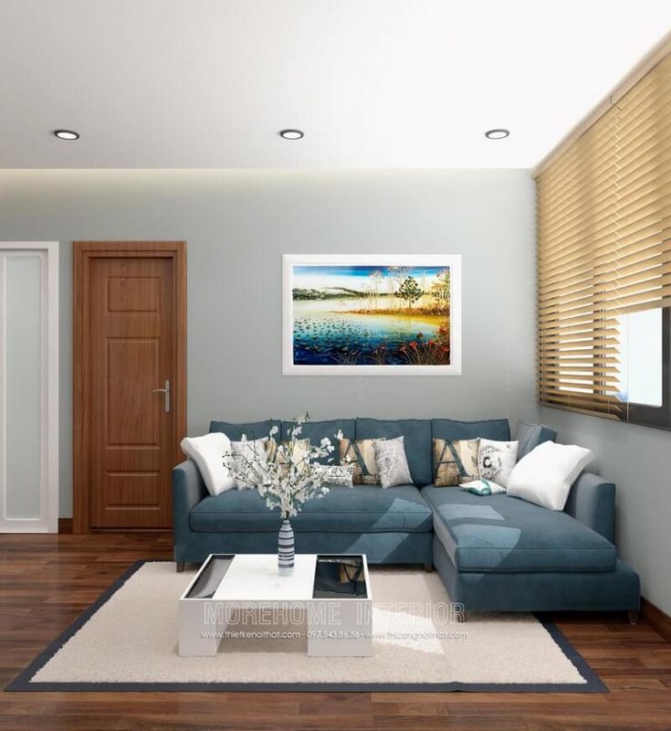 Thiết kế sofa hoàn hảo cho không gian phòng khách của chung cư với phong cách hiện đại năng động kiểu dáng góc tiện lợi với vải bọc mềm mại màu xanh đầy sáng tạo, độc đáo.