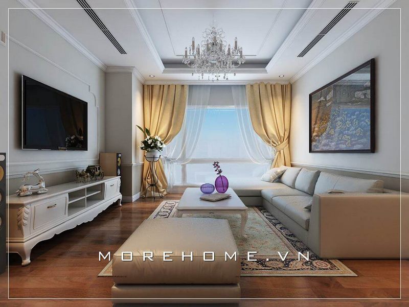 Nội thất phòng khách chung cư được sắp xếp vô cùng hợp lí, không chỉ mang lại một không gian sinh hoạt chung sang trọng, thanh lịch mà không kém phần tiện nghi