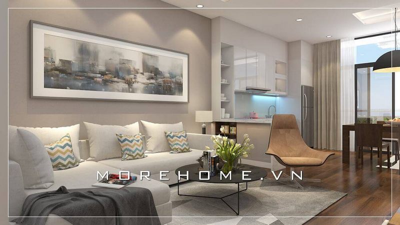 Thiết kế phòng khách liền bếp ăn sử dụng tone màu trắng chủ đạo đẹp cho căn hộ chung cư.