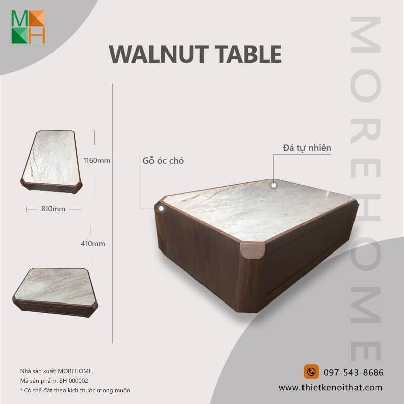 Mẫu bàn trà tân cổ điển bằng gỗ óc chó cao cấp kết hợp mặt đá sang trọng cho phòng khách biệt thự, chung cư, nhà phố