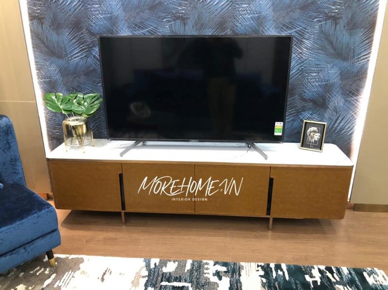 Kệ tivi cho phòng khách với kiểu dáng đơn giản, sử dụng gỗ công nghiệp kết hợp chân kệ inox mạ vàng hiện đại cho chung cư, nhà phố, biệt thự