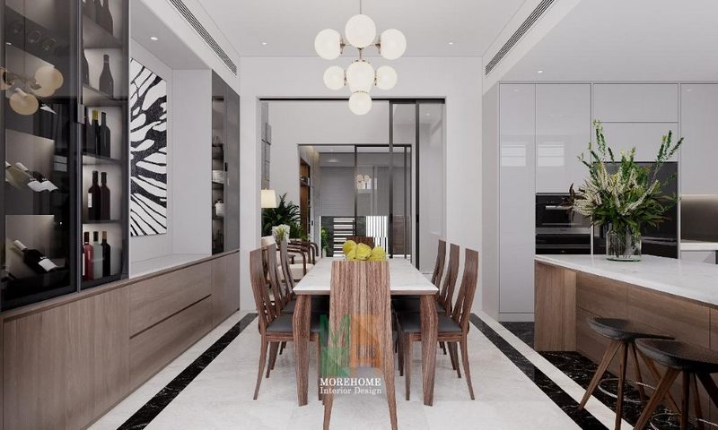 Khu vực ăn uống được liên kết trực tiếp với phòng khách để tiết kiệm diện tích và tăng sự liên kết cho không gian