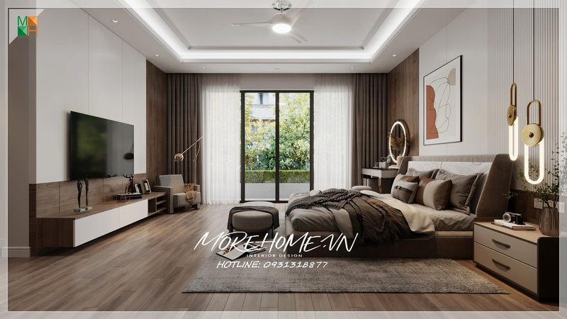 Trong thiết kế nội thất phòng khách biệt thự tân cổ điển, khéo léo được thể hiện qua những chạm khắc tinh xảo của trần nhà, kệ TV gỗ tự nhiên, vách tường của TV, lựa chọn rèm cửa và đèn chùm treo trần, tất cả đều được thiết kế tinh tế và điêu luyện.