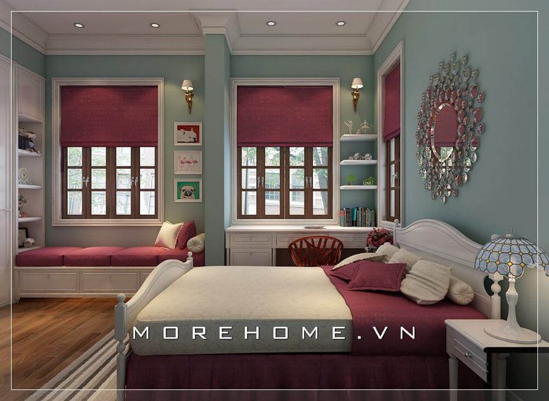 Không gian phòng ngủ được trang trí đẹp, sang trọng và đầy tiện nghi, các chi tiết màu đỏ như đệm giường, rèm cửa... tạo nên một điểm nhấn ấn tượng.