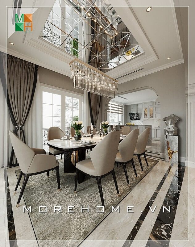 Không gian mở rộng và sang trọng đã được sử dụng để thiết kế phòng ăn biệt thự.