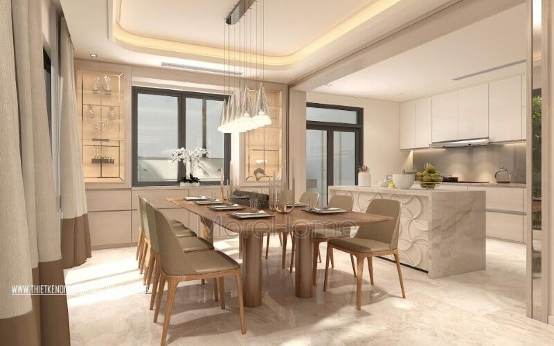 Sự kết hợp hài hòa giữa thiết kế nội thất phòng ăn gỗ tự nhiên, đèn chiếu sáng, tủ kệ hay các chi tiết nhỏ từ cửa sổ, rèm cửa sẽ tạo ra một không gian sống ấn tượng.