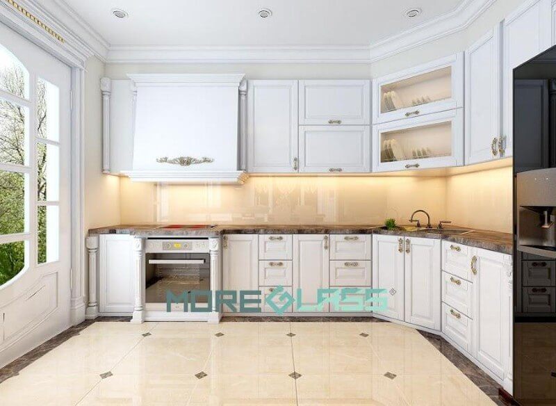 Kính ốp bếp màu kem nhẹ nhàng và tủ bếp cùng gam màu được thiết kế để tạo nên một phong cách ấm cúng cho phòng bếp.