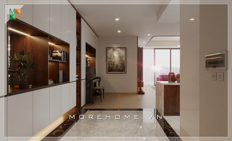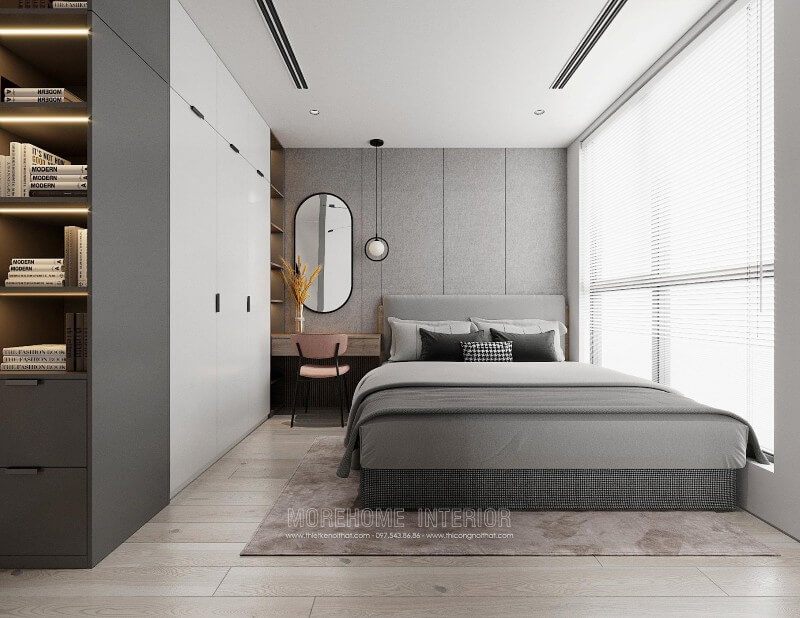 Thiết kế nội thất phòng ngủ chung cư hợp lí, tủ quần áo âm tường sẽ giúp không gian trở nên rộng hơn và tạo cảm giác cơi nới.