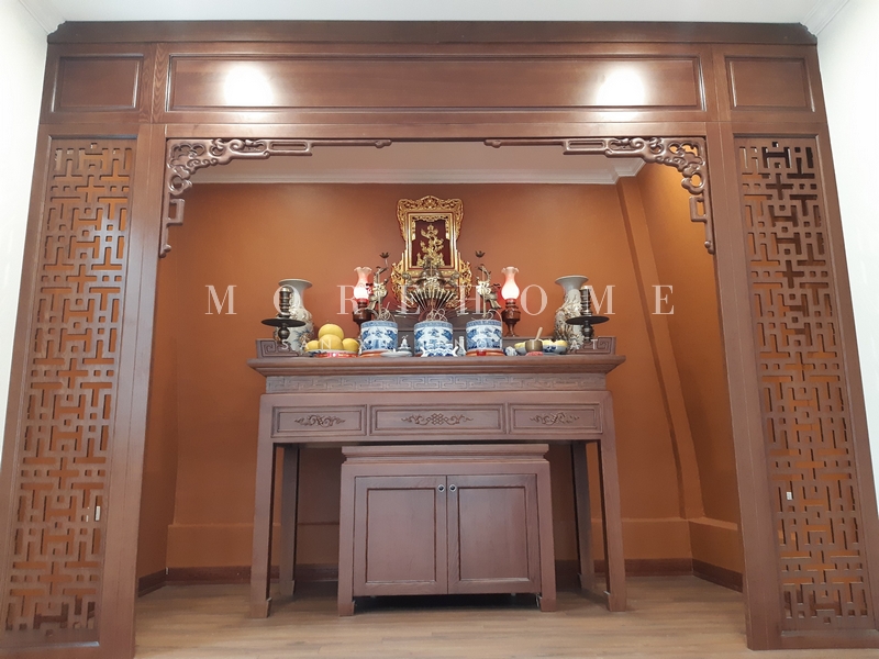 Bàn thờ gia tiên gỗ tự nhiên được đặt ở vị trí trung tâm của không gian phòng để làm nơi các con cháu báo cáo tổ tiên trong ngày lễ quan trọng.
